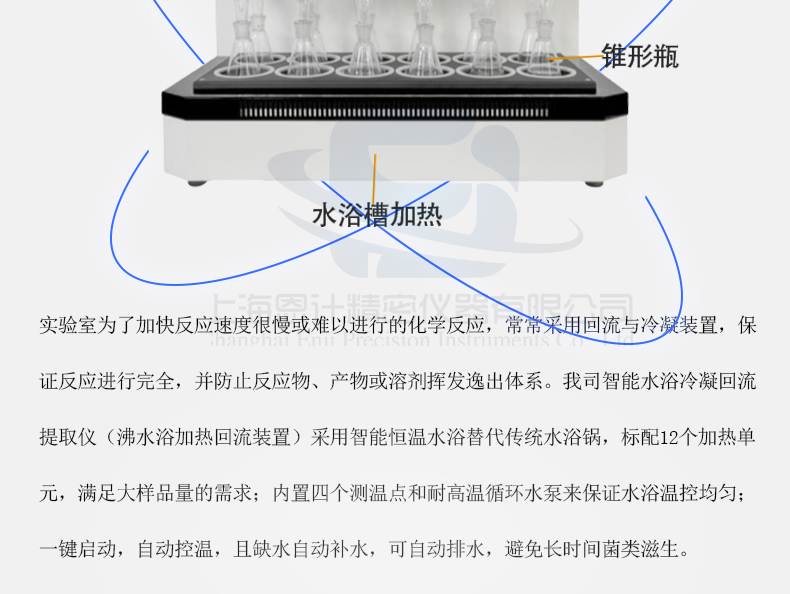 實驗室為了加快反應速度很慢或難以進行的化學反應,常常采用回流與冷凝裝置,保證反應進行完全,并防止反應物、產物或溶劑揮發(fā)逸出體系。我司智能水浴冷凝回流提取儀(沸水浴加熱回流裝置)采用智能恒溫水浴替代傳統(tǒng)水浴鍋,標配12個加熱單元,滿足大樣品量的需求;內置四個測溫點和耐高溫循環(huán)水泵來保證水浴溫控均勻;一鍵啟動,自動控溫,且缺水自動補水,可自動排水,避免長時間菌類滋生。